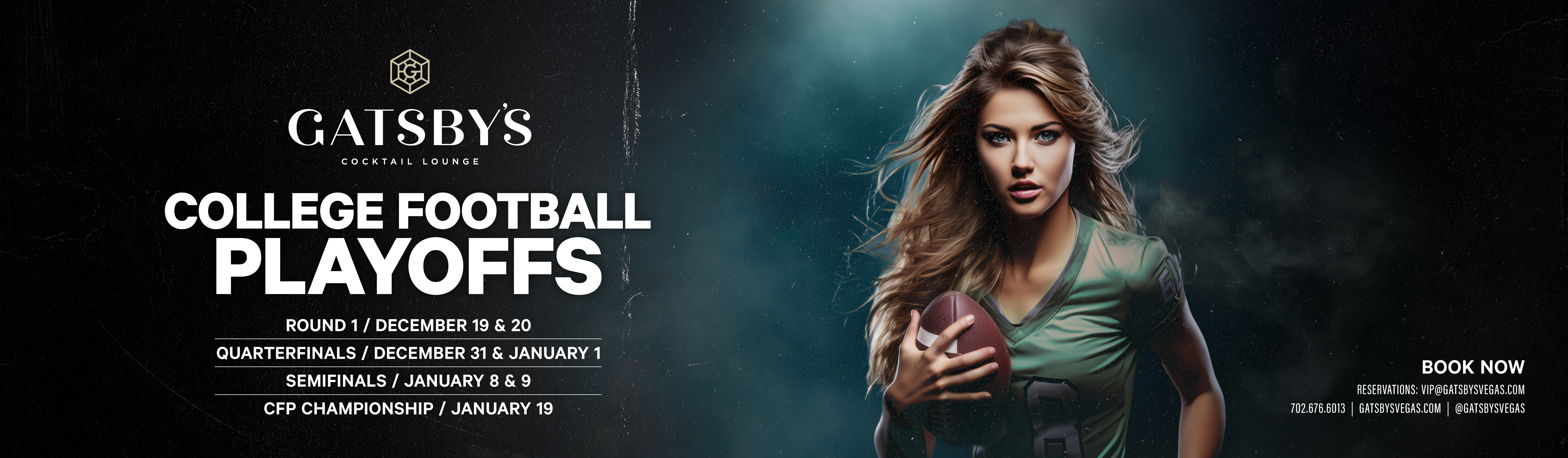 Cap it off with the National Championship on Monday, January 19, 2026, at 4:30 pm PT from Hard Rock Stadium in Miami Gardens, FL. Gatsby's will be the epicenter for this crowning event, with our enhanced setup and vibrant crowd.From the first round to the final whistle, Gatsby's delivers college football viewing in Las Vegas like no other. Ready to secure your seat at the best place to watch college football in Las Vegas? Click the link below to reserve for all playoff games. Look out for exclusive game-day promotions, like cocktail pairings or playoff specials, as we make Gatsby's the definitive Las Vegas college football watch party destination. Let's turn the playoffs into an unforgettable win at Gatsby's!