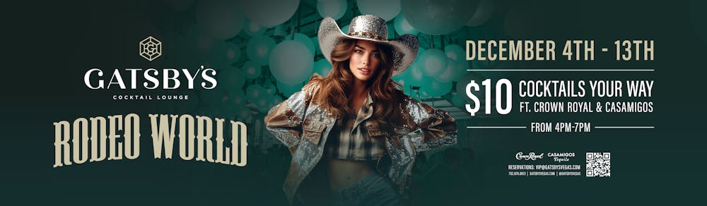 Gatsby's Cocktail Lounge transforms into a country EDM haven for NFR 2025, blending art deco elegance with rodeo energy. From December 4-13, enjoy daily specials like $10 Crown and Casamigos "your way" (customized with mixers for that perfect sip). BOGO cocktails for Resorts World Theatre show ticket holders mean double the fun after Riley Smith’s high-energy country set or Tracy Lawrence’s classic hits. On December 5th, DJ Willy Pake spins country EDM crossovers, kicking off a Thursday-Sunday lineup of similar DJs blending twang with beats. The grand finale? Denim & Rhinestones party on Dec 12 where you can channel your inner Miranda Lambert with rhinestone glam following the Riley Smith show. This Vegas cocktail lounge event series is your NFR Vegas events headquarters, where country meets cocktails in style. The Vibe, Roaring ‘20s Glam Meets Country Rodeo Spirit: